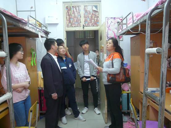 2016年4月24日下午四点,数学与统计学院党总支副书记苗宝军、团总支书记沈会焘,辅导员杜娟以及14级15级的七位班长一起走访本院全部89个学生宿舍,进行宿舍安全卫生检查和宣讲反电信诈骗。