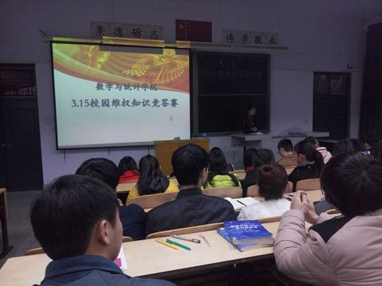 2016年3月13日星期日晚上六点,数学与统计学院在B合十三举行3.15消费者权益竞答赛,团总支书记沈会焘、杜娟辅导员以及主席团成员受邀作为嘉宾,为参赛者打分,目的在于进一步普及大学生消费权益知识,增强法律意识,让他们了解到消费利益在受到侵害的时候可以运用法律武器捍卫自身权益。
